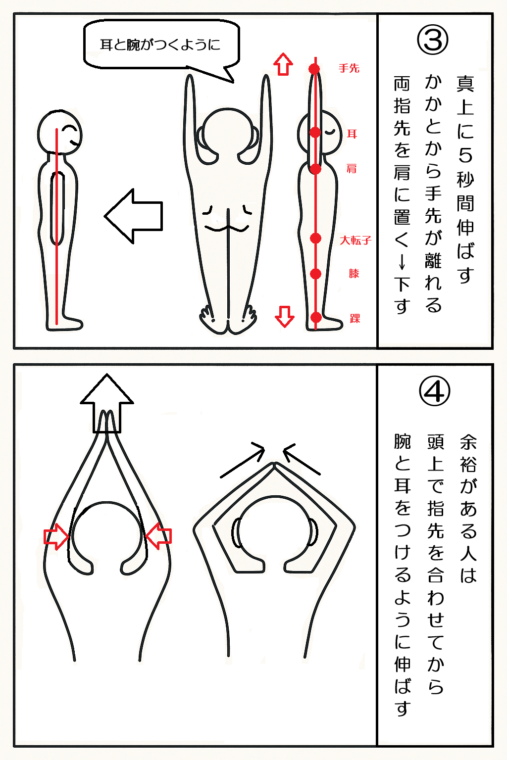 4. 余裕がある方(肩の痛みがない方)は②の状態から、頭上で指先を合わせてから、腕と耳をつけるように伸ばす。