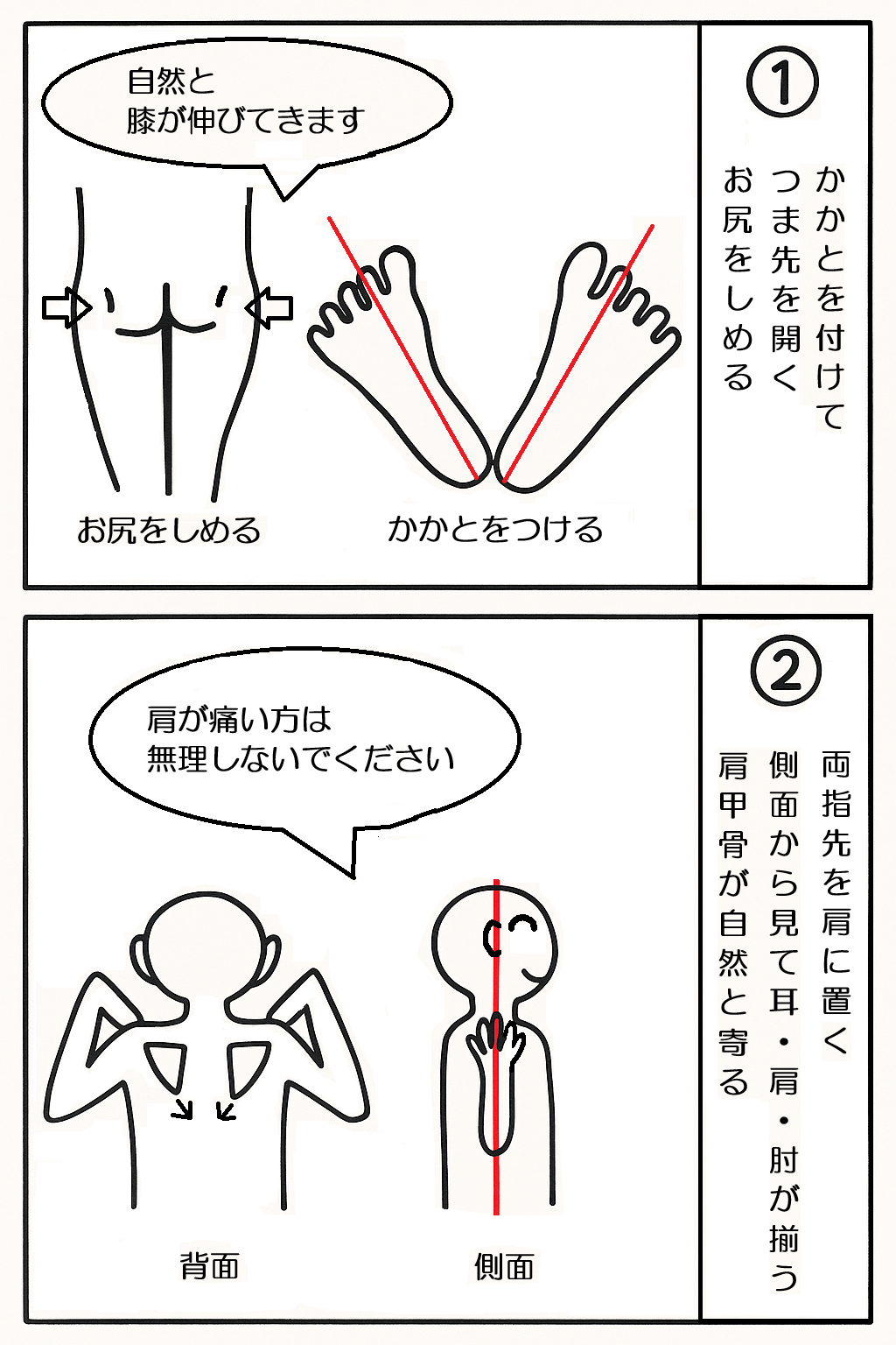 2. 両指先を肩に置く。→側面から見て耳・肩・肘が揃うように。肩甲骨がセットされます。