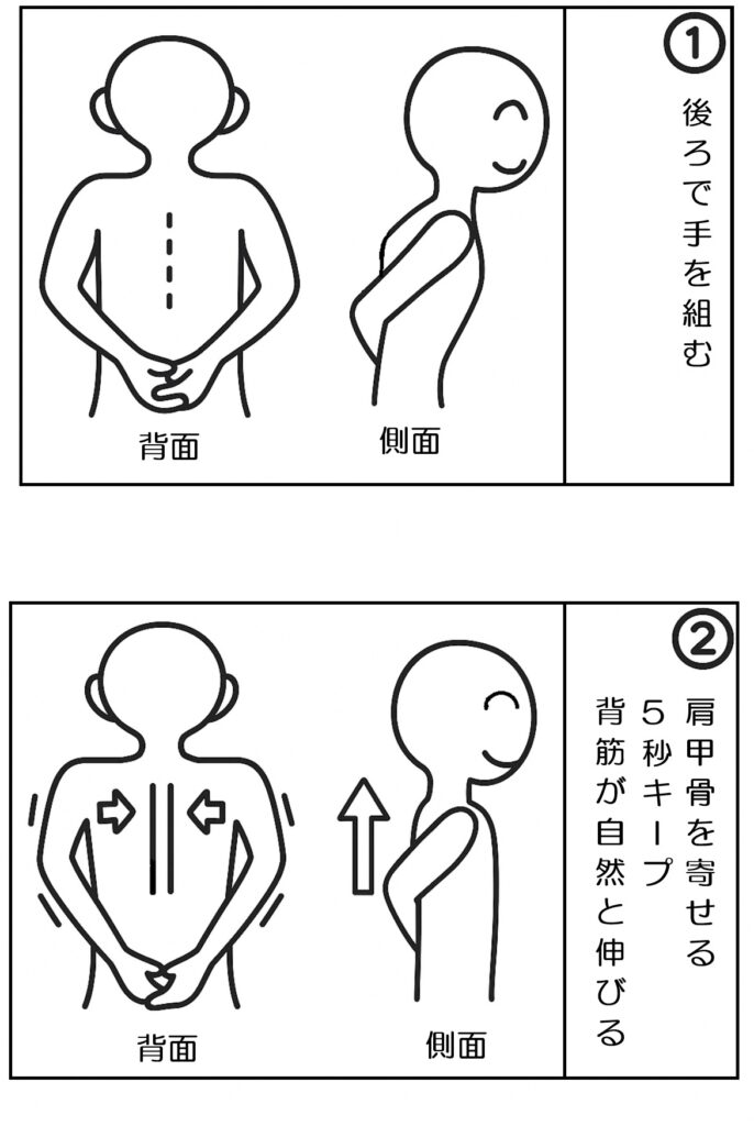 - 肩甲骨を寄せて5秒キープ 背筋が自然と上に伸びる。 無理して反らさなくてOK。 普段動かしていない人が無理をすると、かえって背中を痛める
