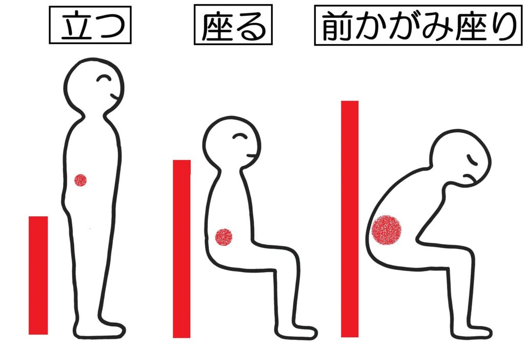 椎間板の負担:「立つ < 座る < 前かがみ座り」